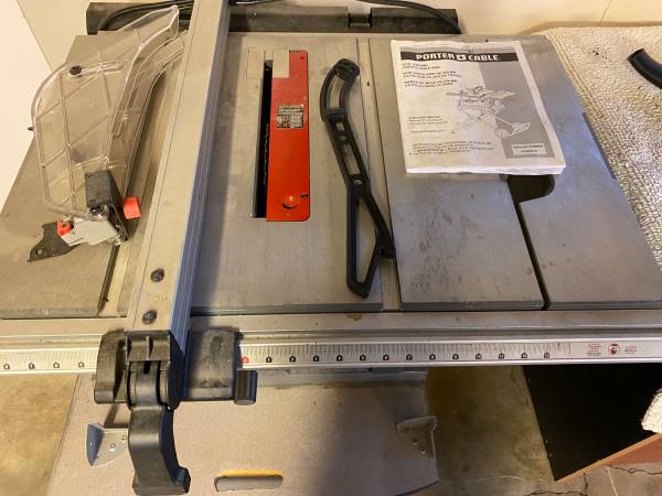 Used Table saw with a homemade table. Porter-cable . Good working order. Model PCB220TS serial# 102308 5000 rpm, corded Electric power source, voltage 120 10” Blade diameter.