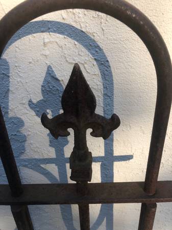 WROUGHT IRON HOSE HOLDER, rusty w/ fleur-de-lis design. Measures 48"h x 9"w x 7.5"d. $15 cash only please. Has 11" stakes(attached) that can be hammered into the ground...super sturdy! $15 cash only please. Check out "georgiapeach to view my other listings.