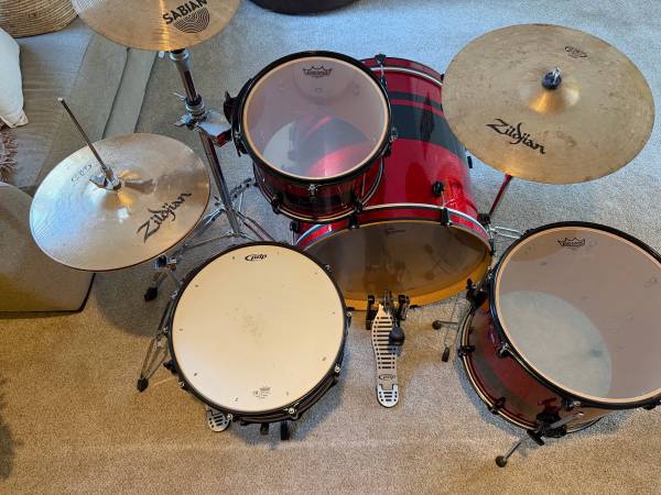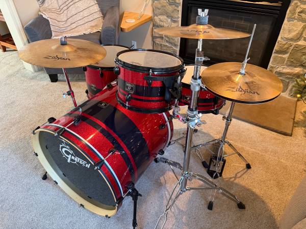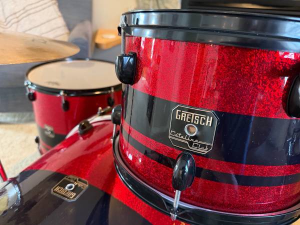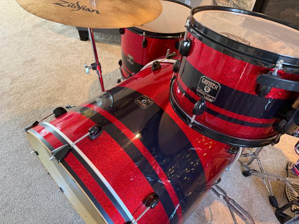 Gretsch Catalina Club drum set in great condition. The drums are made of Mahogany and the sizes are 22x20 bass drum, 12x8 rack tom, 16x14 floor tom, and 14x6.5 matching snare drum. The kit has Remo drum heads all in excellent condition. Zildjian crash/ride and hi hats along with a Sabian crash cymbal. If you’re interested in just the drums along with the tom mount the price would be $500