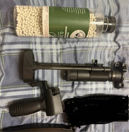 Heckler and Koch MP5K fully decked out. Comes with original box, forward grip piece, no stock cap piece, aftermarket collapse stock, attachment railing, as well as upgraded internals. Internals are Gate Titan V3 advance with usb link, (rewired to come out to back of the gun for easier battery access), 5 mid cap magazines and 1 high cap magazine.