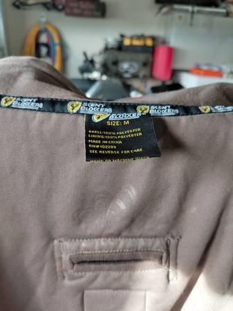 Scentblocker silent camo hunting jacket. Size med. Excellent cond. No stains or tears. 2 zip side pockets,1 zip chest pocket,zipper and snap front.Saftey harness can come through jacket.Great mid...